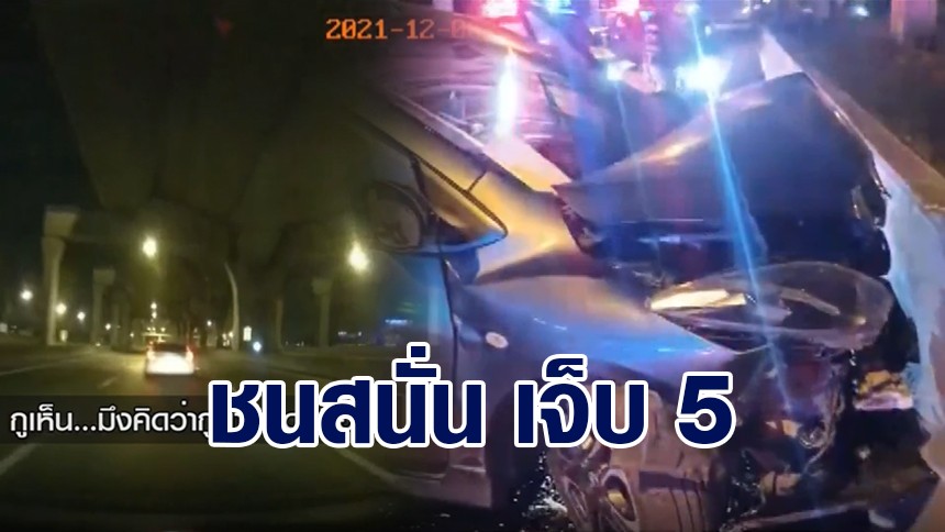 นาทีระทึก เก๋งหักหลบรถคันหน้า ชนแบริเออร์ข้างทาง เจ็บ 5 ราย