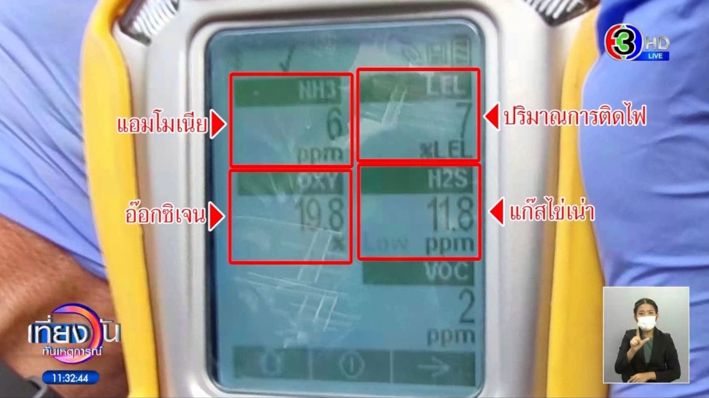 ซึ่งถ้ามองจากหน้าจอ จะเห็นว่า ปริมาณออกซิเจนที่วัดได้ คือ 19.7 เปอร์เซนต์ ซึ่งเจ้าหน้าที่ให้ข้อมูลว่า ปกติปริมาณออกซิเจนต้องสูงถึง 21 เปอร์เซนต์ คนถึงจะหายใจได้ หากต่ำกว่านั้นจะหมดสติทันที และสภาพของคนที่หมดสติมักจะหงายหลังลง ซึ่งคล้ายกับสภาพของผู้บาดเจ็บทั้ง 4 คน ที่เจอตอนอยู่ในบ่อบำบัดน้ำเสีย