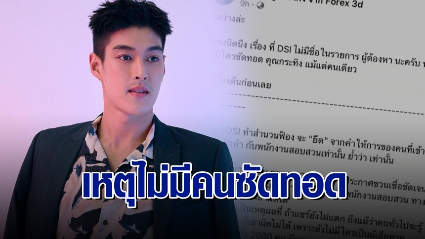 ผู้บริหารช่อง 3 ในฐานะต้นสังกัดของกระทิง ยื่นหนังสือขอความเป็นธรรมต่อ ก.ยุติธรรม คดี Forex 3D ด้านเพจรวบรวมผู้โดนโกง เผยไม่มีผู้เสียหายแจ้งความเอาผิดกระทิง เหตุทยอยจ่ายค่าเสียหายให้แล้ว พร้อมบอกจะไม่เปิดชื่อดาราเพิ่มอีก