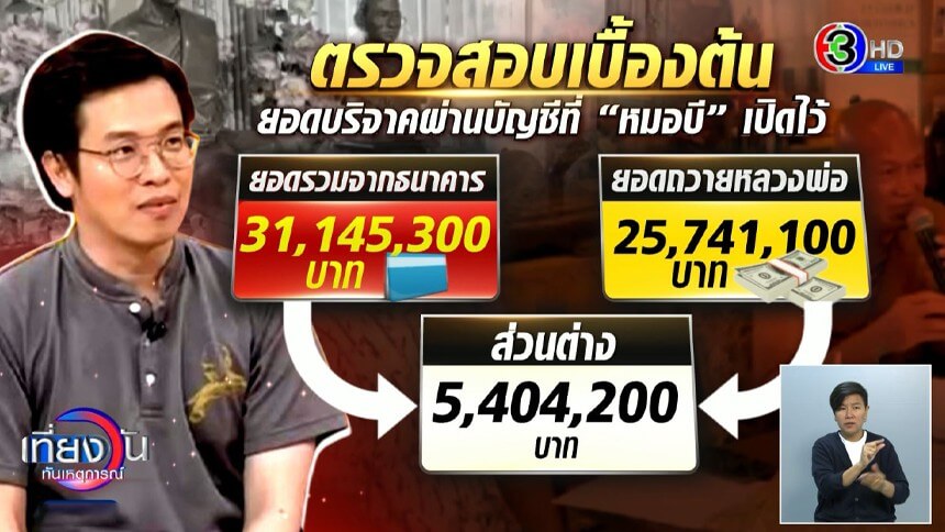 อย่างไรก็ตามจากการตรวจสอบเบื้องต้นของทางเจ้าหน้าที่ สรุปการรับเงินบริจาคจากหมอบีที่ถวายหลวงพ่อเพื่อใช้ในโครงการตามดำริ ยอดรวมจากธนาคารอยู่ที่ 31,145,300 บาท แต่มียอดถวายหลวงพ่ออยู่ที่ 25,741,100 บาท โดยมียอดรวมต่างกันอยู่ที่ 5,404,200 บาท