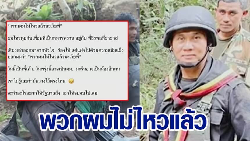 ขณะที่เสียงจากทหารพรานต่างร้องบอกเพื่อน "พวกผมไม่ไหวแล้วเว้ยพี่" หลังจากทหารไทยสูญเสียขาอีก 1 ราย วอนรัฐบาลสั่งการให้จบๆ โดยเฟซบุ๊ก จ่าไอซ์ ทัพฟ้า ได้โพสต์ข้อความระบุว่า ได้โทรคุยกับเพื่อนที่เป็นทหารพราน อยู่กับ พี่ธีรพลที่ขาขาด เสียงเล่าออกมาจากหัวใจ ร้องไห้ แต่แฝงไปด้วยความเข้มแข็ง บอกผมว่า