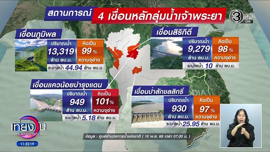 สำนักงานทรัพยากรน้ำแห่งชาติหรือ สทนช. ประชุมบริหารจัดการน้ำ เพื่อปรับแผนให้สอดรับตามสถานการณ์ หลังมีปริมาณน้ำในเขื่อนหลักเพิ่มจากอิทธิพายุ "คัลแมกี" ทำให้เมื่อวานนี้ต้องเพิ่มการระบายน้ำเขื่อนเจ้าพระยาสูงสุด 2,800 ลูกบาศ์กเมตรต่อวินาที