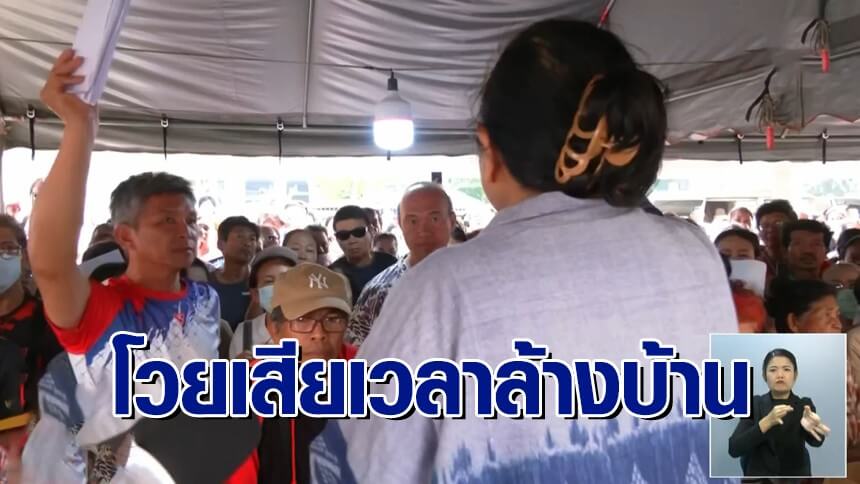 จากนั้น 09.30 น. เจ้าหน้าที่เทศบาลฯ เดินทางมาถึง ชาวบ้านต่างส่งเสียงโวยวาย ด้วยความไม่พอใจที่เจ้าหน้าที่มาช้า ซึ่งเจ้าหน้าที่เทศบาลได้ยืนบนเก้าอี้พยายามตะโกนชี้แจงว่า "คนที่ลงทะเบียนผ่านออนไลน์แล้วให้กลับได้เลย ไม่ต้องยื่นเอกสารแล้ว กรณีเจ้าบ้านให้ใช้บัตรประชาชนอย่างเดียว" แต่ชาวบ้านก็ยังส่งเสียงดังโวยวาย จนเจ้าหน้าที่ตบโต๊ะ บอกให้เงียบ ๆ ก่อน เพราะจะอธิบายขั้นตอน มันเสียงดัง ได้ได้ยินเสียง ถ้าไม่อยู่ในความสงบจัดระบบไม่ได้