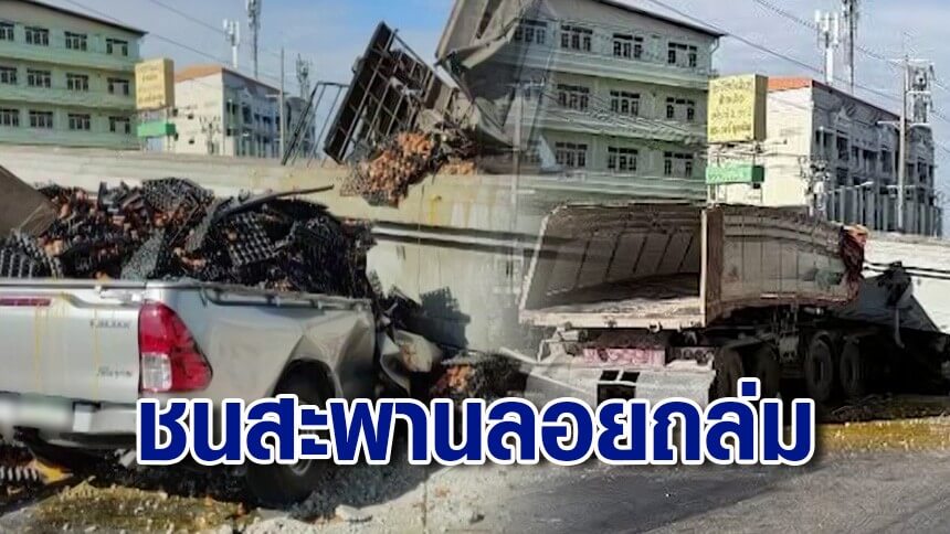 ระทึก! รถบรรทุกดัมพ์ค้าง ชนสะพานลอยถล่ม ทับคนขับกระบะดับ 1