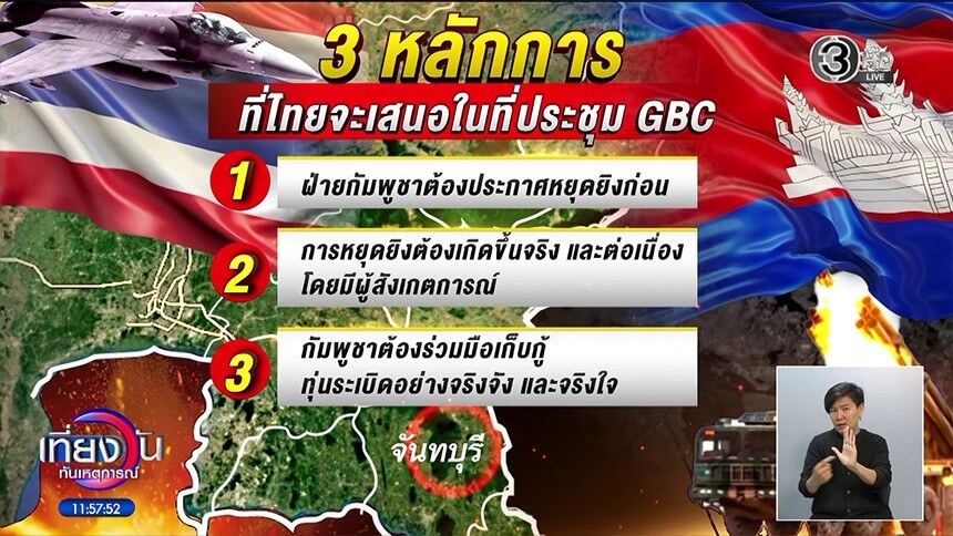 วันนี้จับตาการประชุมคณะกรรมการชายแดนทั่วไป หรือ GBC ไทย-กัมพูชา เพื่อหาแนวทางการหยุดยิงที่ จ.จันทบุรี ซึ่งเป็นผลมาจากการประชุมรัฐมนตรีอาเซียน เมื่อวันจันทร์ที่ผ่านมา ขณะที่ท่าทีของกัมพูชายังไม่ชัดเจนหลังเมื่อวานพยายามขอเปลี่ยนสถานที่ไปจัดที่ มาเลเซีย