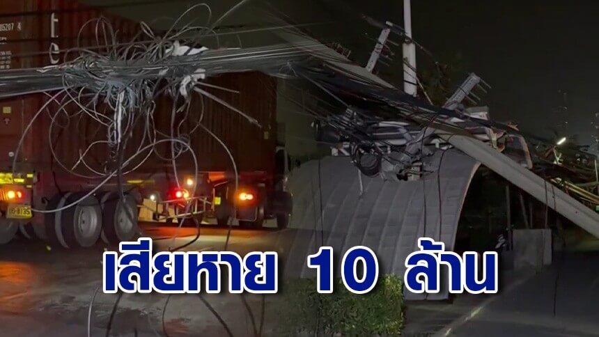 เกิดเหตุระทึกบนถนนสุขุมวิท ขาออกมุ่งหน้าบางปู รถพ่วงเกี่ยวสายเคเบิล ดึงเสาไฟฟ้าล้มลงมากว่า 70 ต้น งานนี้คนขับรถพ่วงงานเข้า เพราะความเสียหายประเมินเบื้องต้น 10 ล้านบาท