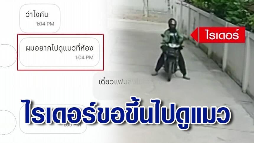 โดยมีกล้องวงจรปิดเป็นหลักฐาน ไรเดอร์มาส่งอาหารแล้วไม่ยอมกลับ นั่งอยู่บนรถกว่าครึ่งชั่วโมง แต่ได้ส่งข้อความมาขอไลน์และบอกว่าอยากขึ้นมาดูแมวบนห้องพักของลูกค้า ทางลูกค้าสงสัยจึงถามว่า เอาไปทำไร ทางไรเดอร์บอกว่า เอามาไว้คุย พร้อมกับบอกว่า ตัวเองยังอยู่ที่หอ ถามว่าห้องอยู่ไหนให้เอาไปส่งให้ไหม ผมอยากไปดูแมวที่ห้อง ทางลูกค้าจึงตอบกลับไปว่า เดี๋ยวแฟนลงไปเอาข้าวให้ค่ะ ทางไรเดอร์ ก็ตอบกลับว่า ตัดพ้อกันขนาด (คล้ายๆ ทำร้ายจิตใจ)