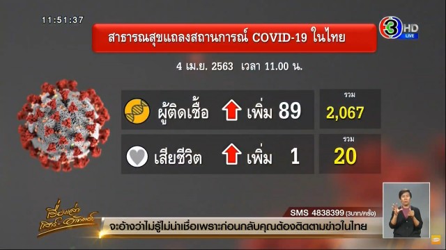 ศูนย์บริหารสถานการณ์การแพร่ระบาดของโรคติดเชื้อไวรัสโคโรนา 2019 (ศบค.) แถลงประเทศไทยพบยอดผู้ติดเชื้อใหม่เพิ่ม 89 คน เป็นกลุ่มที่เกี่ยวข้องกับผู้ป่วยก่อนหน้านี้ 33 คน เป็นผู้ป่วยรายใหม่ 48 คน และรอบสอบสวนโรคอีก 8 คน ยอดสะสม 2,067 คน