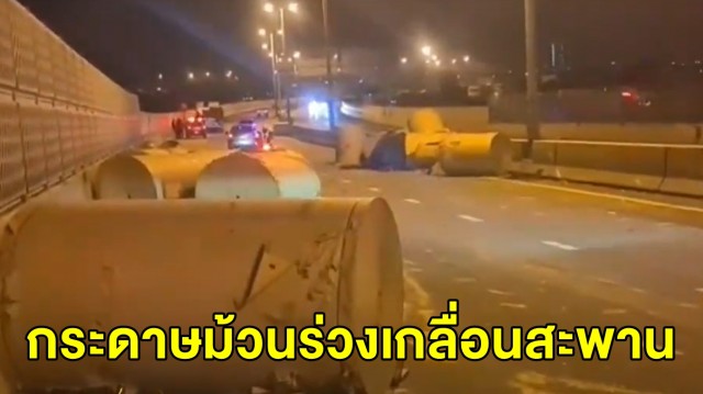 กระดาษม้วนหล่นจากรถพ่วง เกลื่อนสะพานภูมิพล