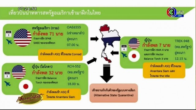 วานนี้ (3 ส.ค.) พล.อ.ณฐพนธ์ ศรีสวัสดิ์ ที่ปรึกษาพิเศษกองทัพบก ในฐานะผู้อำนวยการศูนย์บริหารสถานการณ์แพร่ระบาดของโรคติดเชื้อไวรัสโคโรนา 2019 กองทัพบก (ผอ.ศบค.ทบ.) กล่าวถึงกรณีที่มีทหารจากสหรัฐอเมริกาเดินทางเข้ามาประเทศไทย 71 นาย และเดินทางมาจากญี่ปุ่น 32 นาย โดยเข้ารับการกักตัวใน State Quarantine โรงแรมแห่งหนึ่งในกทม. ว่า