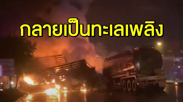 บุรีรัมย์ระทึก รถบรรทุกน้ำมันชนสิบล้อ น้ำมันไหลกลายเป็นทะเลเพลิง ลามไหม้ตึก-รถอื้อ