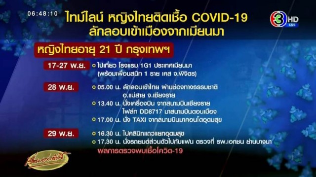 ไทม์ไลน์หญิงอายุ 36 ปี ชาวจ.ราชบุรี มีประวัติไปทำงานที่สถานบันเทิงเมียนมา โดยมีการเปิดผ่านหลังว่า วันที่ 23-24 พ.ย. หญิงรายนี้ได้ไปเที่ยวที่โรงแรม 1G1 ประเทศเมียนมา ก่อนจะลอบกลับไทยผ่านช่องทางธรรมชาติ และไปยังสนามบินเชียงใหม่