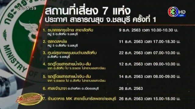 สำนักงานสาธารณสุขจังหวัดชลบุรี ได้แจ้งไทม์ไลน์ ประชาชนท่านใดได้เดินทางไปยังวันและสถานที่ ดังต่อไปนี้