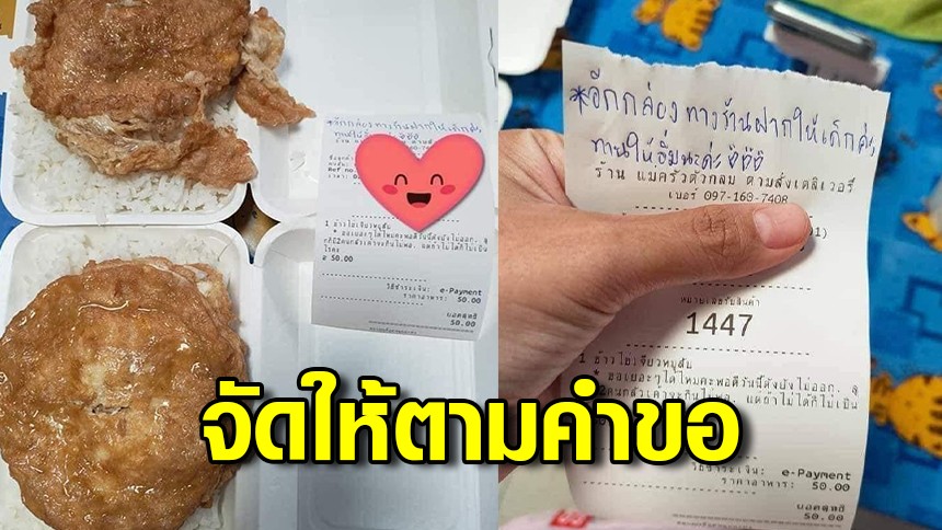 จากนั้นทางร้านได้ทำข้าวไข่เจียวเพิ่มให้อีกกล่องพร้อมเขียนปากการะบุใบเสร็จกลับไปให้ว่า "อีกกล่องทางร้านฝากให้เด็กค่ะ ทานให้อิ่มนะคะ"