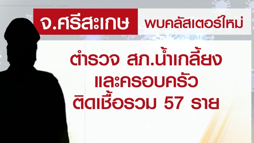 สถานการณ์โควิด-19 ที่ จ.ศรีสะเกษ พบคลัสเตอร์เจ้าหน้าที่ตำรวจภูธรน้ำเกลี้ยง จ.ศรีสะเกษ มากกว่า 50 นาย จากการตรวจกลุ่มสัมผัสเสี่ยงสูงคือเพื่อนร่วมงาน ซึ่งก็พบว่ามีการติดเชื้อรวมทั้งหมด 51 นาย จากเจ้าหน้าที่ตำรวจใน สภ.ทั้งหมด 60 นาย