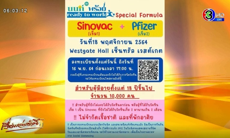 นนทบุรี เปิดลงทะเบียนสูตรไขว้พิเศษ ซิโนแวค-ไฟเซอร์ ในโครงการ "นนท์พร้อม ready to work" (Special Formula) สูตรวัคซีน Sinovac+Pfizer