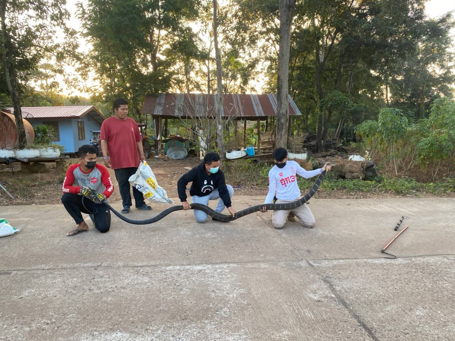 โดยจุดเกิดเหตุเป็นลานหน้าบ้าน ชาวบ้านบอกว่า มีงูขนาดใหญ่ขดอยู่ที่กองเศษไม้และยางรถยนต์เก่า ใกล้กับแปลงมันสำปะหลัง กู้ภัยฯ จึงนำไฟฉายเข้าไปส่องดู ก็พบว่ามีงูนอนขดอยู่ใต้ยางรถยนต์ กู้ภัยฯ จึงใช้เหล็กตะขอดึงตัวงูออกมาจากจุดดังกล่าว แล้วช่วยกันหลอกล่องูเอาไว้