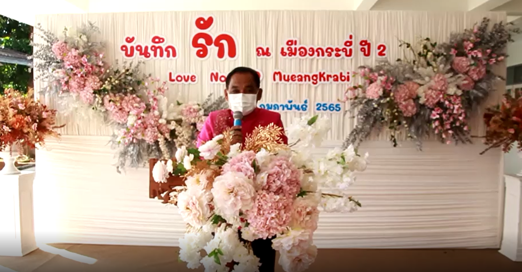 วันนี้(14 ก.พ.65) นายชัยวุฒิ บัวทอง นายอำเภอเมืองกระบี่ เป็นประธานเปิดกิจกรรม “บันทึกรัก ณ เมืองกระบี่” (Love Note @ Mueang Krabi ) ซึ่งได้มีการตั้งโต๊ะรับจดทะเบียนสมรส ณ ที่ว่าการอำเภอเมืองกระบี่ มีคู่รักเดินทางเข้ามาร่วมกิจกรรมจำนวน 50 คู่ พร้อมกล่าวอวยพรแสดงความยินดีกับคู่รักที่เข้าร่วมกิจกรรม มีหัวหน้าส่วนราชการ ร่วมเป็นสักขีพยาน ณ สำนักทะเบียนอำเภอเมืองกระบี่