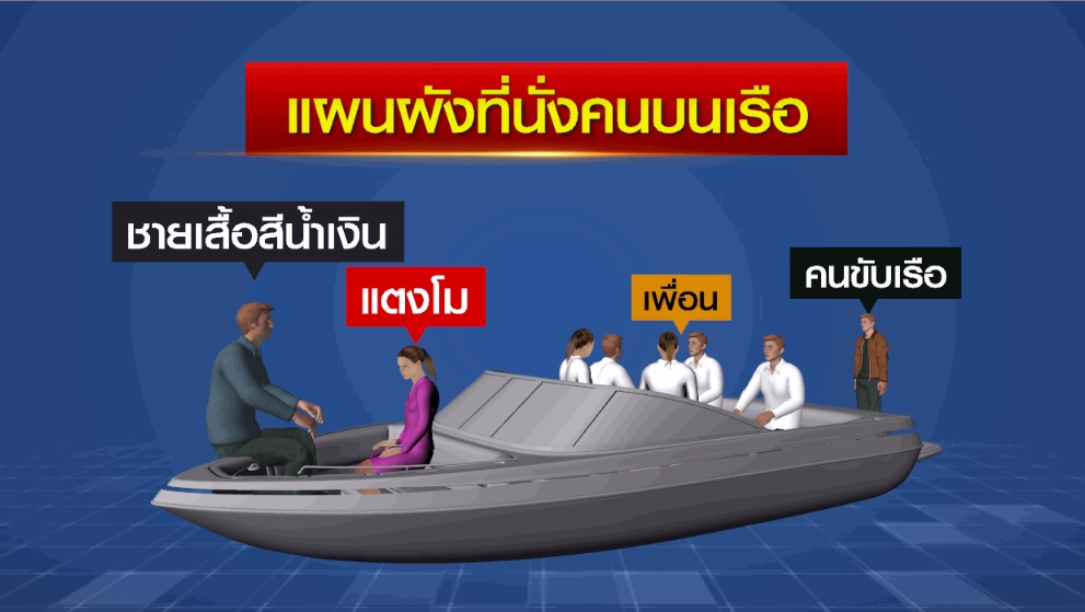 และนี่คือภาพจำลองที่ผู้โพสต์คนนี้วาดไว้ ระบุว่า เห็นผู้หญิงสวมชุดสีชมพูนั่งเหงาๆ ที่หัวเรือคนเดียว คาดว่า น่าจะเป็นแตงโม และใกล้กันมีผู้ชายขาวตี๋สวมเสื้อสีน้ำเงินเข้มยืนอยู่ ขณะที่ด้านในเรือมีเพื่อนอีก 2-3 คน แต่มองไม่ชัด เพราะเปิดเพลงและเปิดไฟเทค ส่วนคนขับก็ประจำอยู่ท้ายเรือ