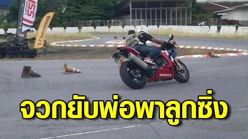 พ่อนักซิ่งพาลูกน้อยใส่เป้สะพายหลัง เทสรถในสนามแข่ง ชาวเน็ตสวดยับอันตราย
