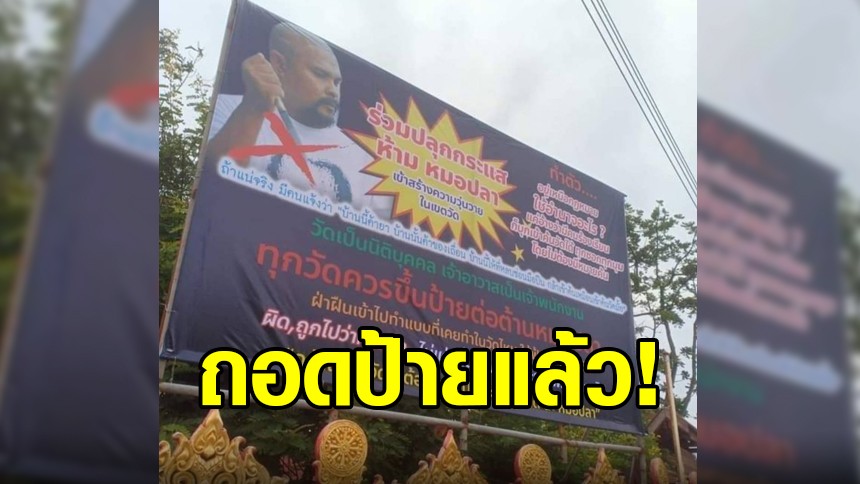 'หมอปลา' เตรียมไปเยี่ยม วัดขึ้นป้ายต้าน ล่าสุดปลดแล้ว เจ้าอาวาสไม่รู้ใครเอามาติด