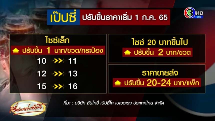 สุดอั้น บริษัทน้ำอัดลมยักษ์ใหญ่ปรับขึ้นราคา นายกสมาคมผู้ค้าส่ง-ปลีกไทย เผยเป๊ปซี่ แจ้งปรับราคาขายปลีกทุกขนาด และทุกแพ็กเกจจิ้ง 1-2 บาท ต่อขวด / กระป๋อง หลังแบกรับต้นทุนบรรจุภัณฑ์ไม่ไหว โดยราคาขายปลีกใหม่จะปรับขึ้นอย่างเป็นทางการตั้งแต่วันที่ 1 ก.ค. นี้