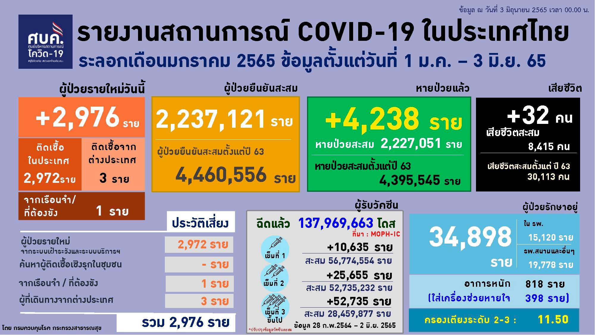 วันนี้ (3 มิ.ย.) ศบค. รายงานสถานการณ์โควิด-19 พบผู้ติดเชื้อรายใหม่ 2565 รวม 2,976 ราย จำแนกเป็น ผู้ป่วยจากในประเทศ 2,673 ราย ผู้ป่วยมาจากต่างประเทศ 3 ราย ผู้ป่วยสะสม 2,237,121 ราย (ตั้งแต่ 1 มกราคม 2565)