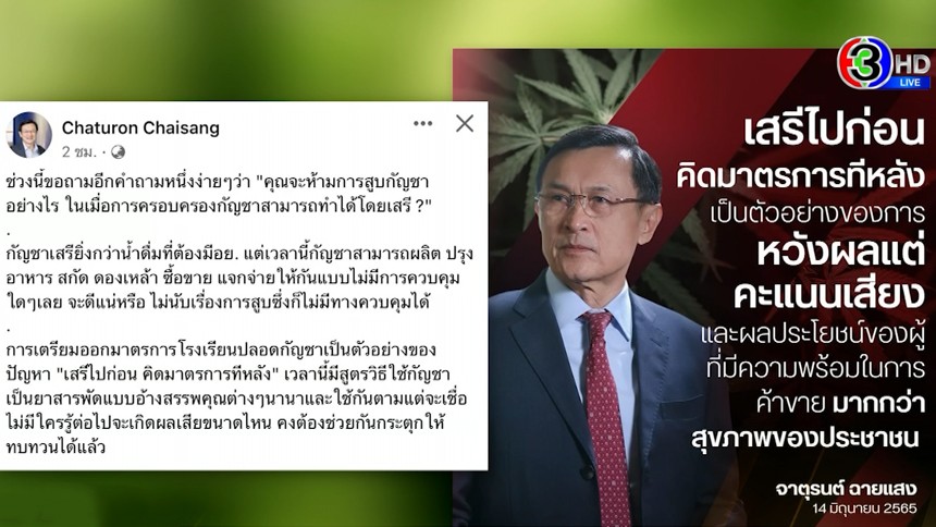 พรบ.ยังไม่ผ่าน มาตรการยังไม่ได้คิด แต่เปิดเสรีกัญชาไปแล้ว เป็นตัวอย่างของการทำอะไรหวังผลแต่ในทางคะแนนเสียงและผลประโยชน์ของผู้ที่มีความพร้อมในการค้าขาย มากกว่าสุขภาพของประชาชน