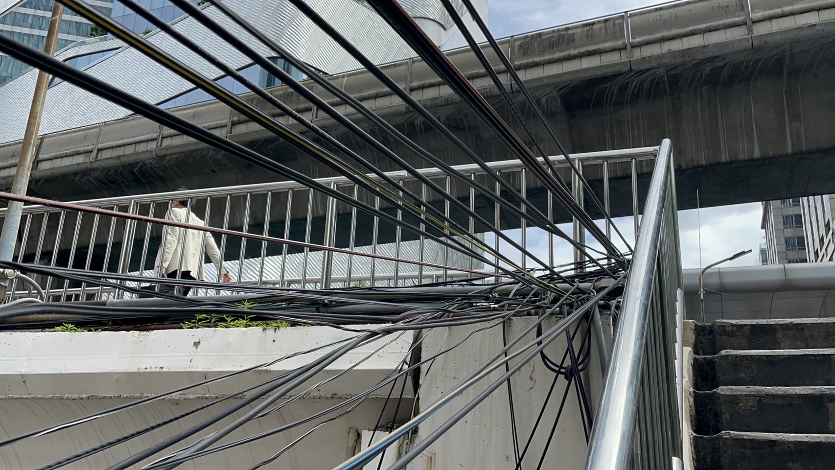 นี่เป็นภาพ สะพานลอย ข้ามแยกเพลินจิต ที่ผู้คนเดินผ่านไปมา ทีมข่าวของเราลงไปดู ปรากฎยังไม่มีการแก้ไข ทีมข่าวบอกว่า มีทั้ง สายไฟและสายสื่อสาร ที่ ใช้ตัวสะพานลอย เป็นเสาเดินสาย พาดมัดรอบสะพานลอย