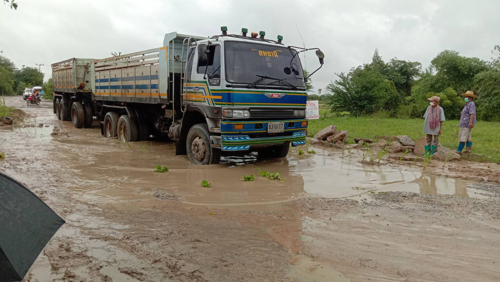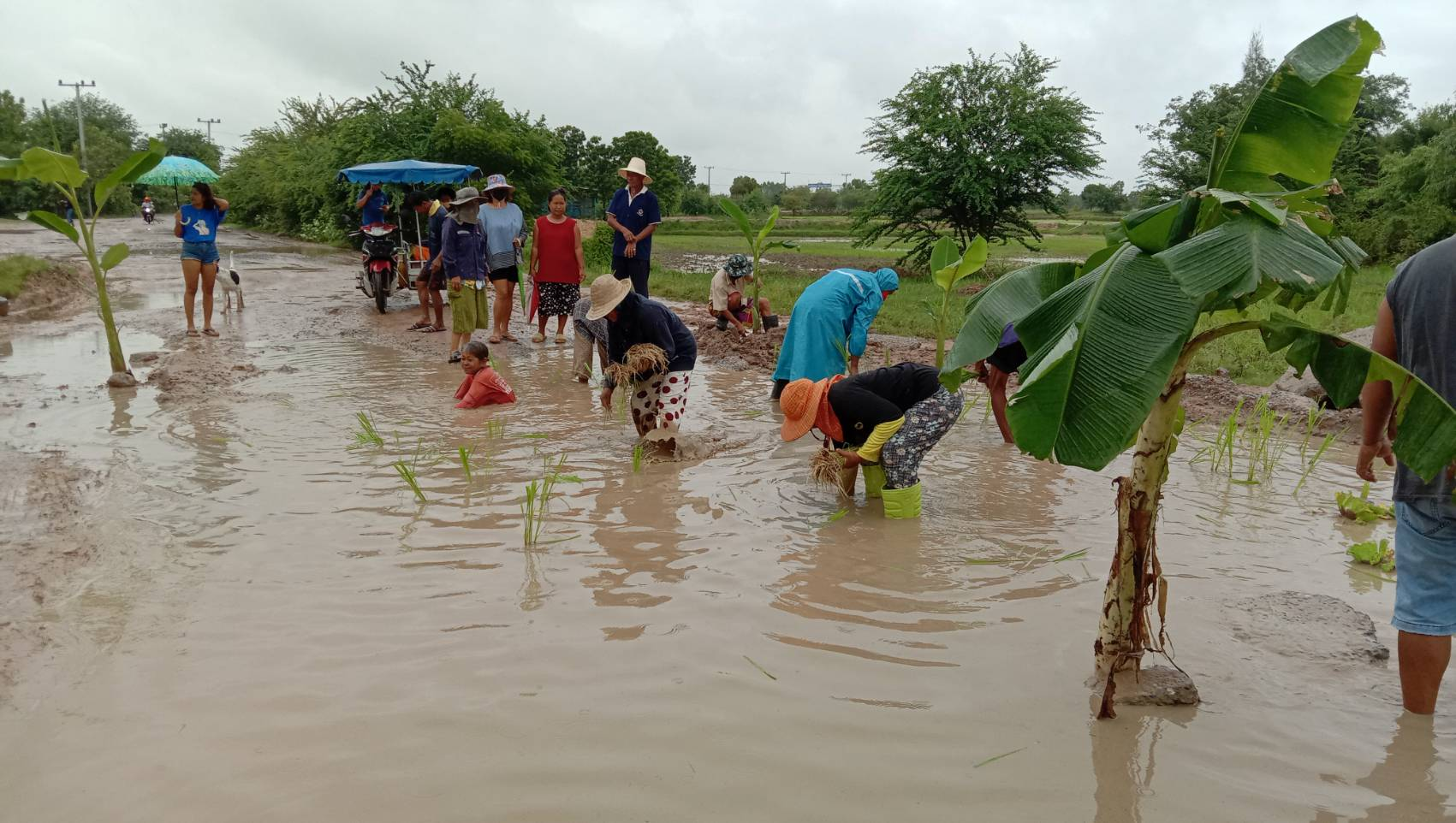 โดยชาวบ้านได้นำเอาต้นกล้วย ต้นกล้าข้าว ปักดำปลูกลงไปในหลุมกลางถนน แถมชาวบ้านยังลงว่ายน้ำเล่นกลางถนน ซึ่งเป็นหลุมขนาดใหญ่มาก พร้อมทั้งเขียนป้ายข้อความว่า “ลุงตู่ช่วยชาวบ้านด้วย” เพื่อเป็นการประชดหน่วยงานที่รับผิดชอบถนน ที่ไม่ลงมาแก้ไขปัญหาที่เกิดขึ้นให้กับชาวบ้าน