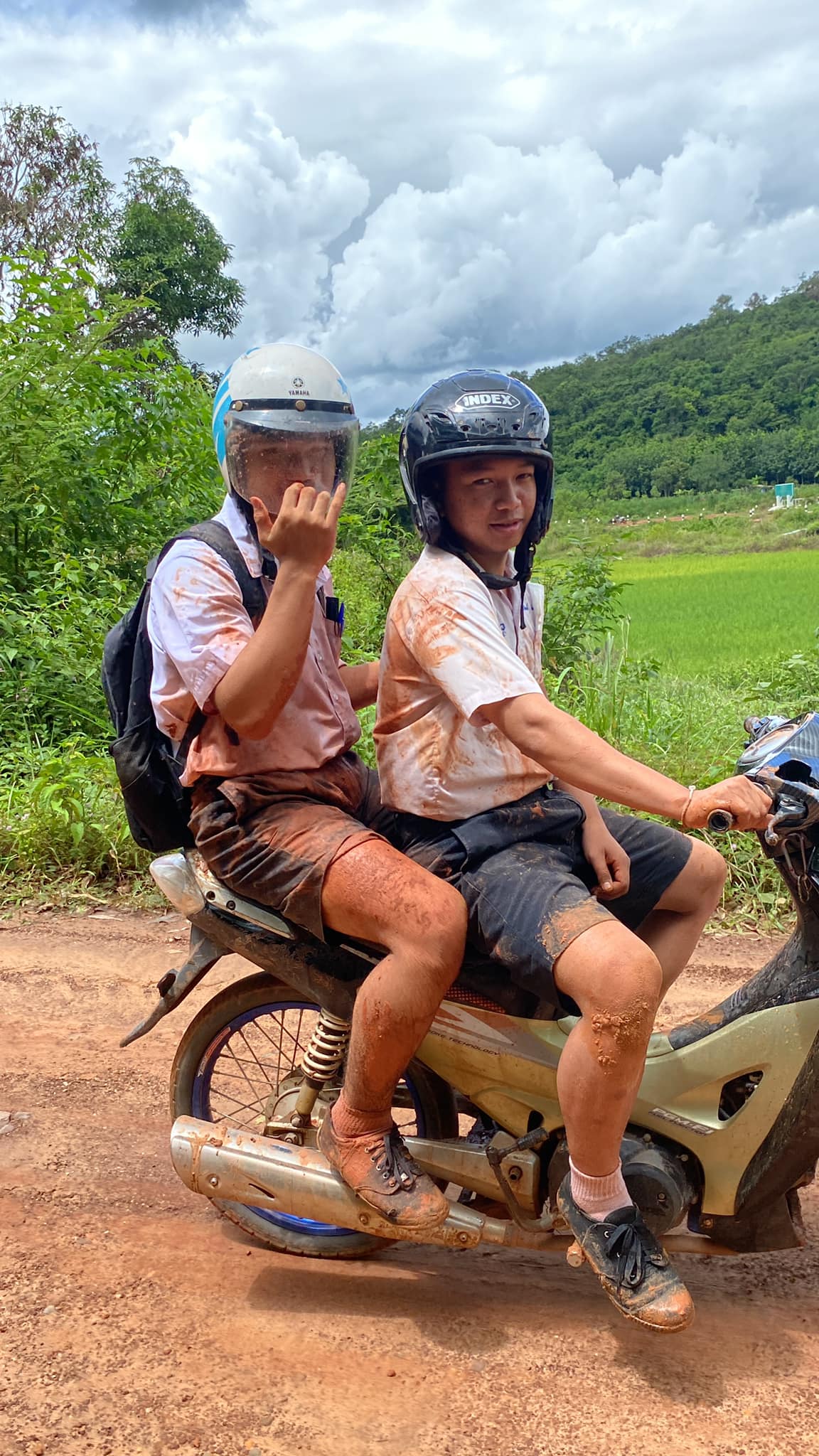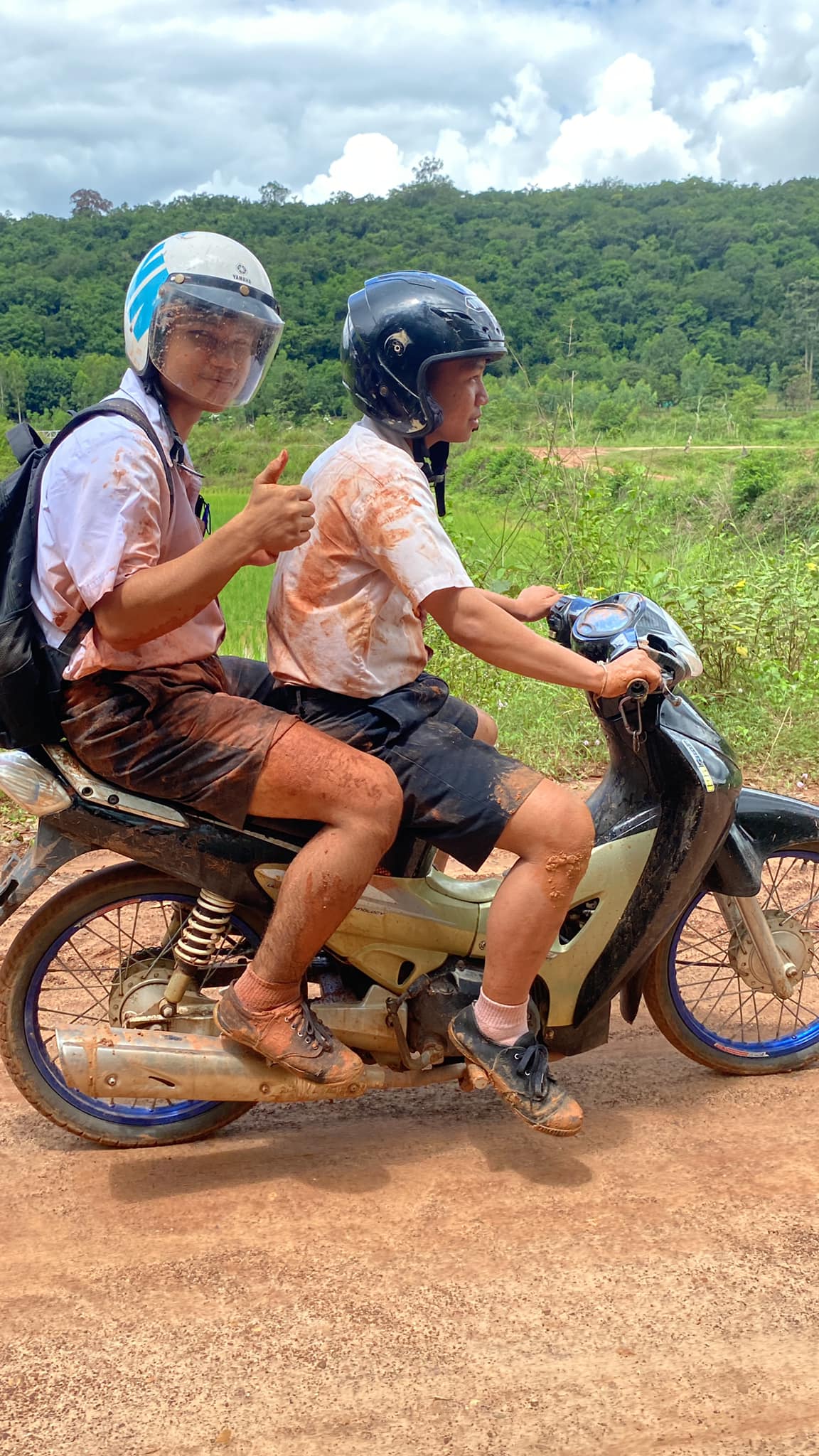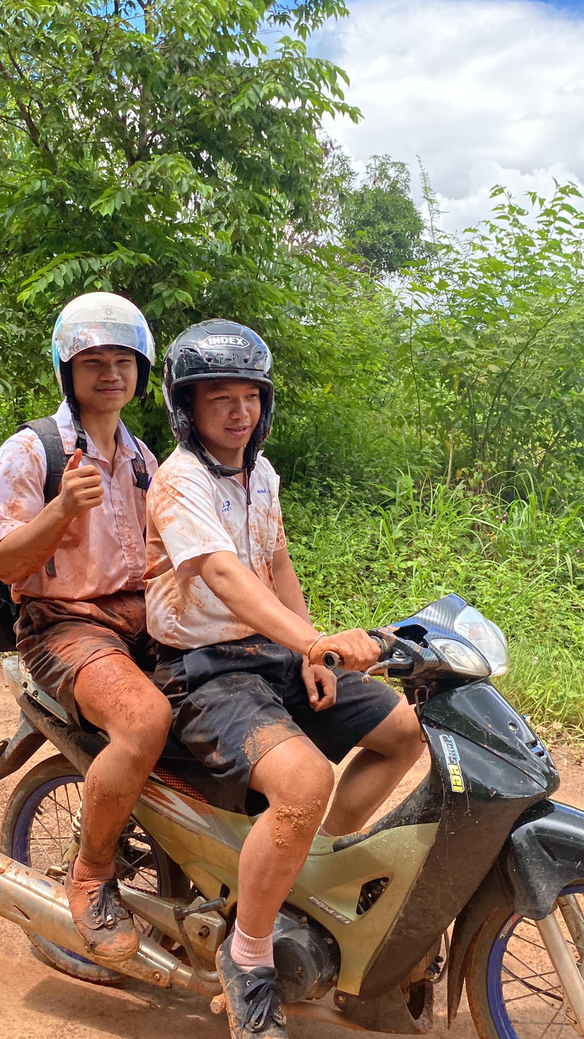 ผู้สื่อข่าวสอบถามไปยังเด็กหนุ่มที่ปรากฏในคลิป ซึ่งเป็น 2 หนุ่มนักเรียนชั้น ม.6 ชื่อ นายรุ่งสุริยา กับ นายกิตติมศักดิ์ประสบเหตุรถจักรยานยนต์ล้มเสื้อผ้านักเรียนเลอะโคลน เล่าว่าวันที่12 ก.ค.ที่ผ่านมากำลังขี่จักรยานยนต์ไปโรงเรียนเกิดฝนตก ทำให้เส้นทางถนนลูกรัง ที่เป็นหลุมเป็นบ่อเละ ประจวบกับมีรถใหญ่ส่วนมา รถจึงล้มเละไม่เป็นท่า