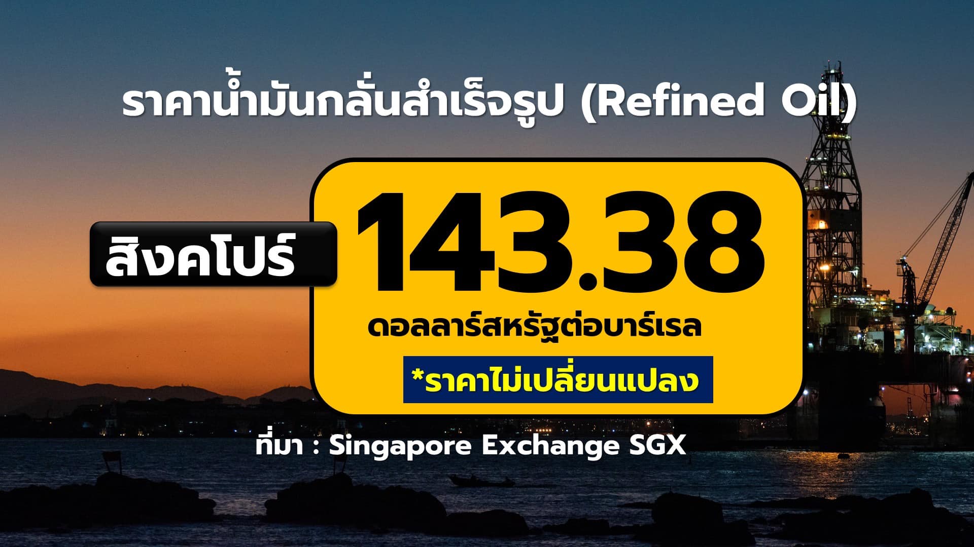 ส่วนราคาน้ำมันสำเร็จรูปตลาดสิงคโปร์ ยังคงไม่เปลี่ยนแปลง และซื้อขายอยู่ที่ระดับ 143.38 ดอลล่าร์ต่อบาร์เรล
