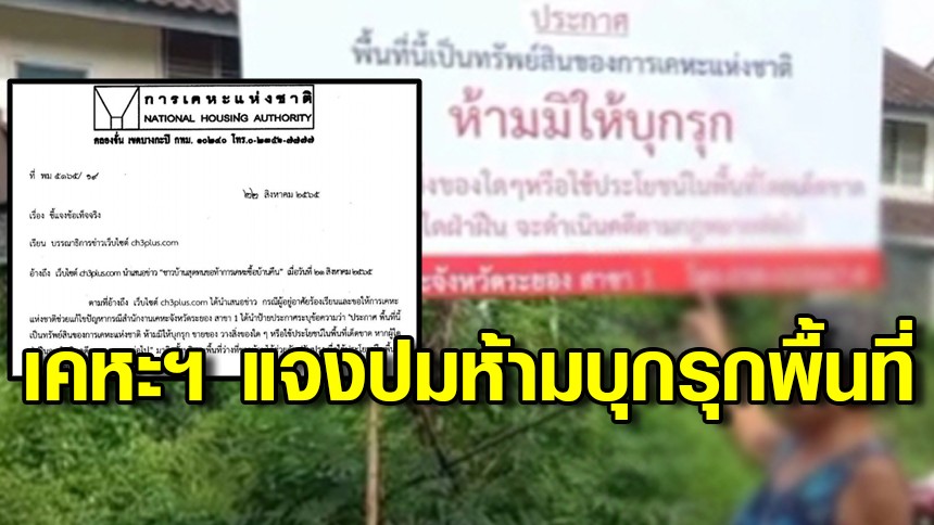 ตามที่อ้างถึง เว็บไชต์ ch3plus.com ได้นำเสนอข่าว กรณีผู้อยู่อาศัยร้องเรียนและขอให้การเคหะแห่งชาติช่วยแก้ไขปัญหา กรณีสำนักงานเคหะจังหวัดระยอง สาขา 1 ได้นำป้ายประกาศระบุข้อความว่า "ประกาศ พื้นที่นี้เป็นทรัพย์สินของการเคหะแห่งชาติ ห้ามมิให้บุกรุก ขายของ วางสิ่งของใด ๆ หรือใช้ประโยชนในพื้นที่เด็ดขาด หากผู้ใดฝ่าฝืนจะดำเนินคดีตามกฎหมายต่อไป" มาติดตั้งบริเวณพื้นที่ว่างที่ชาวบ้านได้ช่วยกันปรับปรุง เพื่อใช้ประโยชน์ในพื้นที่ดังกล่าวนั้น
