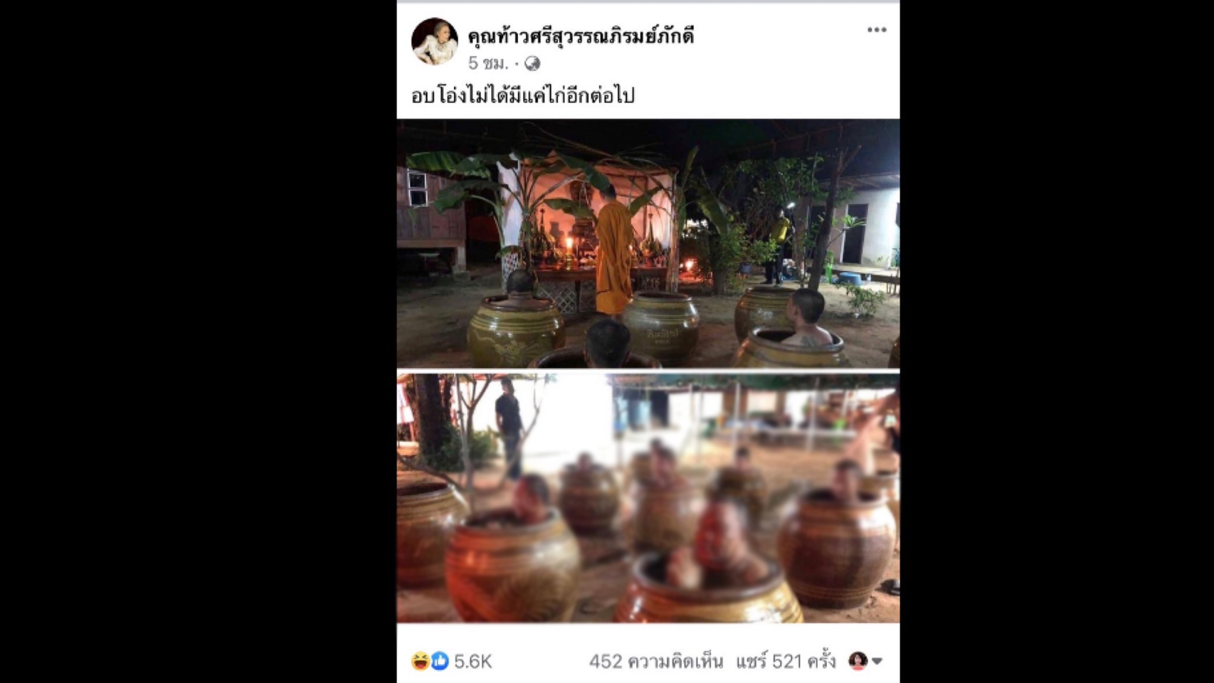 จากกรณีเพจเฟซบุ๊กชื่อ คุณท้าวศรีสุวรรณภิรมย์ภักดี โพสต์ภาพพระสงฆ์กว่า 7 รูป นั่งทำพิธีกรรมแปลกใหม่คล้ายไก่อบโอ่งโดยมีพระสงฆ์ลงไปพนมมือและหลับตาโดยขดตัวอยู่ภายในโอ่งลายมังกรที่มีน้ำอยู่ข้างในตอนเวลากลางคืน พร้อมระบุข้อความว่า "อบโอ่งไม่ได้มีแค่ไก่อีกต่อไป " ซึ่งทำให้ชาวโซเชียลต่างวิพากษ์วิจารย์ว่าพิธีกรรมดังกล่างใช่กิจของสงฆ์หรือไม่