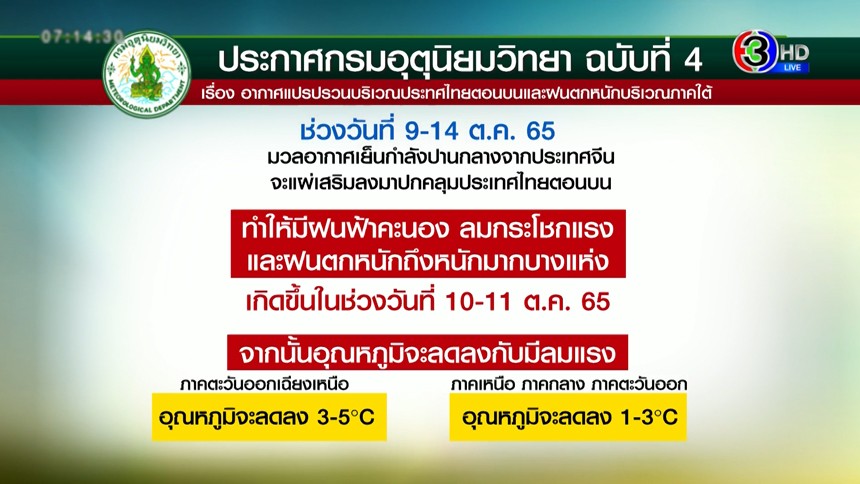 หลังจากนั้นอุณหภูมิจะลดลงกับมีลมแรง โดยภาคตะวันออกเฉียงเหนือ อุณหภูมิจะลดลง 3-5 องศาเซลเซียส ส่วนภาคเหนือ ภาคกลาง และภาคตะวันออก อุณหภูมิจะลดลง 1-3 องศาเซลเซียส ขอให้ประชาชนบริเวณดังกล่าวระวังอันตรายจากสภาพอากาศแปรปรวนที่มีฝนตกหนัก ลมกระโชกแรง และอุณหภูมิลดลง รวมถึงดูแลสุขภาพไว้ด้วยสำหรับลมตะวันออกพัดปกคลุมอ่าวไทยและภาคใต้มีกำลังแรงขึ้น ทำให้ภาคใต้มีฝนตกหนักถึงหนักมาก ในช่วงวันที่ 10–11 ตุลาคม 2565