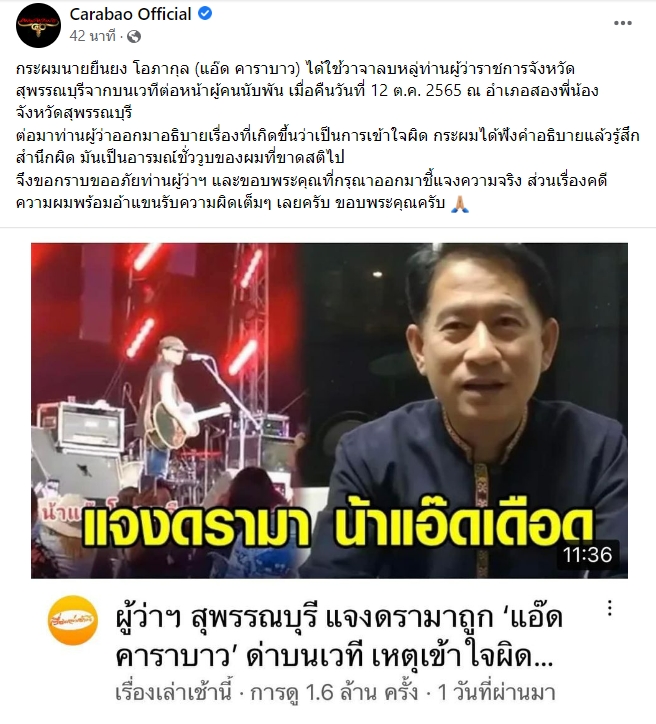 เพจ Carabao Official ออกมาโพสต์ขอโทษ ผู้ว่าจังหวัดสุพรรณบุรี หลังระเบิดอารมณ์ใส่ บนเวทีคอนเสิร์ตเมื่อคืนวันที่ 12 ต.ค. ที่ผ่านมา ถึงกรณีที่เจ้าตัวไม่ได้เล่นคอนเสิร์ต งานอนุสรณ์ดอนเจดีย์ประจำปี 65 และต้องการเคลียร์กับทางฝ่ายงานเกี่ยวข้อง โดยเฉพาะทางจังหวัด จนกระทั่งผู้ว่าฯได้ออกมาชี้แจงถึงประเด็นดังกล่าว โดยทางเพจได้โพสต์ว่า