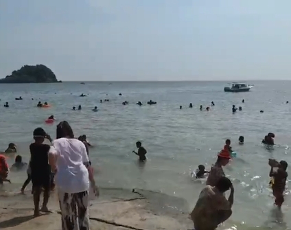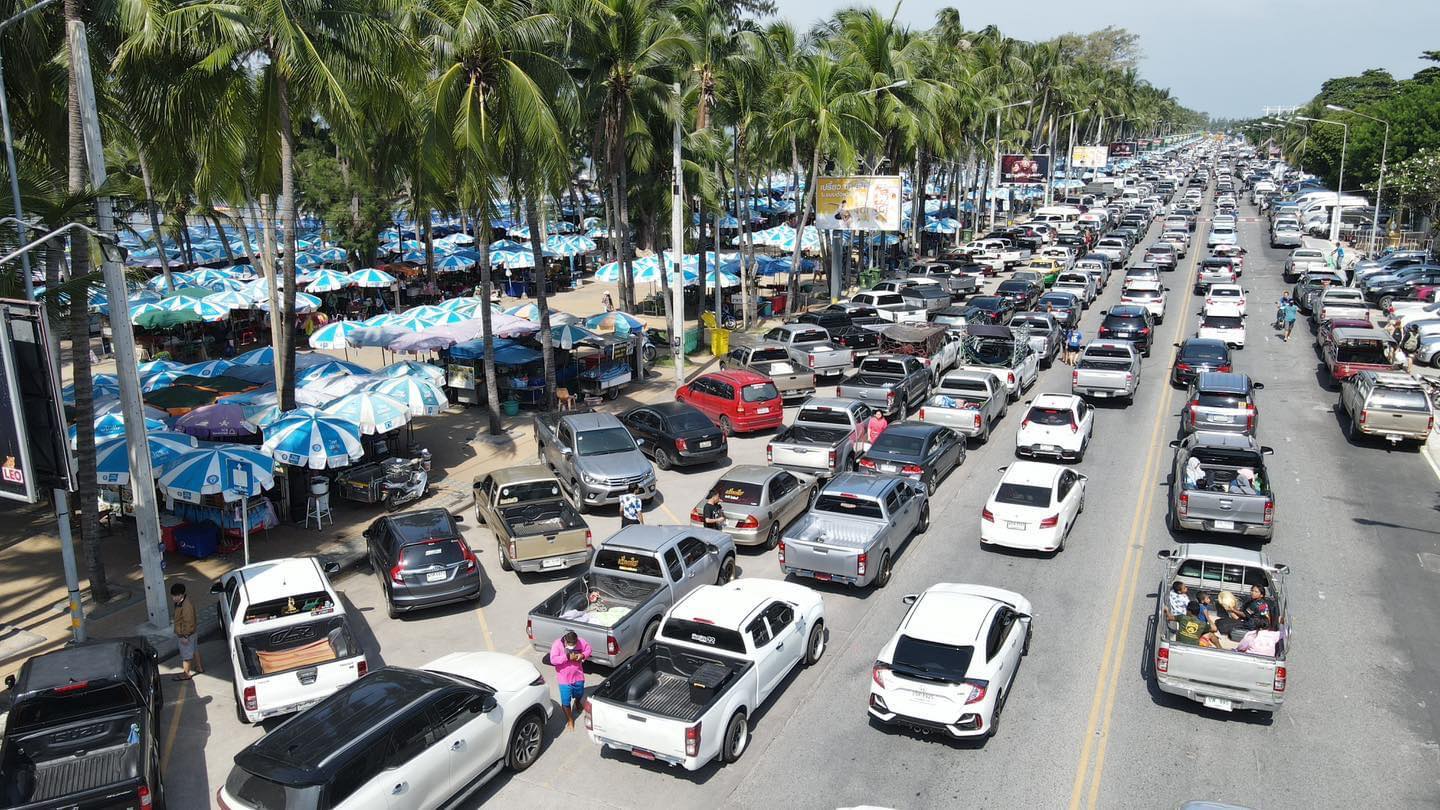 โดยตลอดทางเข้าชายหาดรถติดยาว โดยบริเวณชายหาดที่จอดรถเต็มแน่นไปด้วยรถนักท่องเที่ยวที่แห่ เข้ามาท่องเที่ยว จำนวนมาก