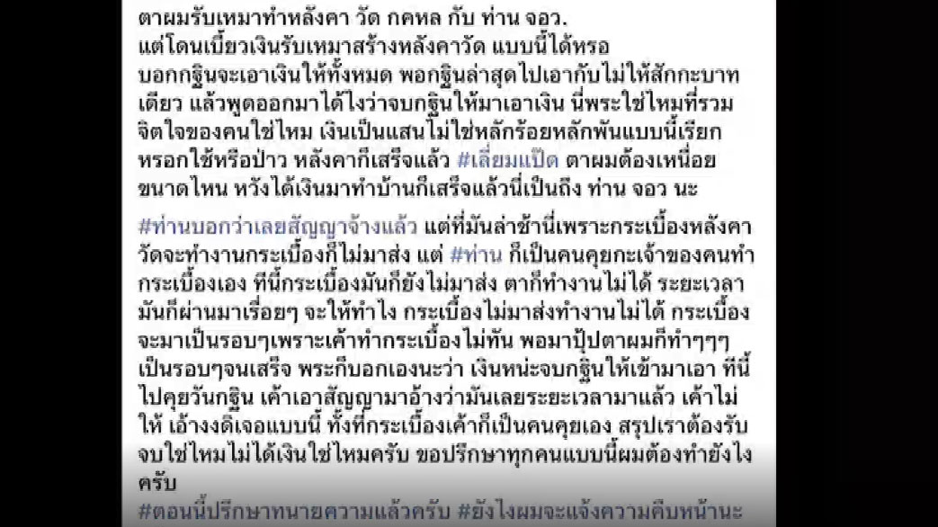 จากกรณี ผู้ใช้เฟซบุ๊กรายหนึ่ง ได้โพสต์ข้อความลงบนเพจ เรารักพนัสนิคม ว่า “ตาผมรับเหมาทำหลังคาวัด ที่หนึ่ง กคหล กับ ท่าน จอว.แต่โดนเบี้ยวเงินรับเหมาสร้างหลังคาวัด แบบนี้ได้หรอ บอกกฐินจะเอาเงินให้ทั้งหมด พอกฐินล่าสุดไปเอากับไม่ให้สักกะบาทเดียว แล้วพูดออกมาได้ไงว่าจบกฐินให้มาเอาเงิน นี่พระใช่ไหมที่รวมจิตใจของคนใช่ไหม เงินเป็นแสนไม่ใช่หลักร้อยหลักพันแบบนี้เรียกหรอกใช้หรือเปล่า หลังคาก็เสร็จแล้ว เลี่ยมแป๊ด ตาผมต้องเหนื่อยขนาดไหน หวังได้เงินมาทำบ้านก็เสร็จแล้วนี่เป็นถึง ท่าน จอว นะ ท่านบอกว่าเลยสัญญาจ้างแล้ว แต่ที่มันล่าช้านี่เพราะกระเบื้องหลังคาวัดจะทำงานกระเบื้องก็ไม่มาส่ง