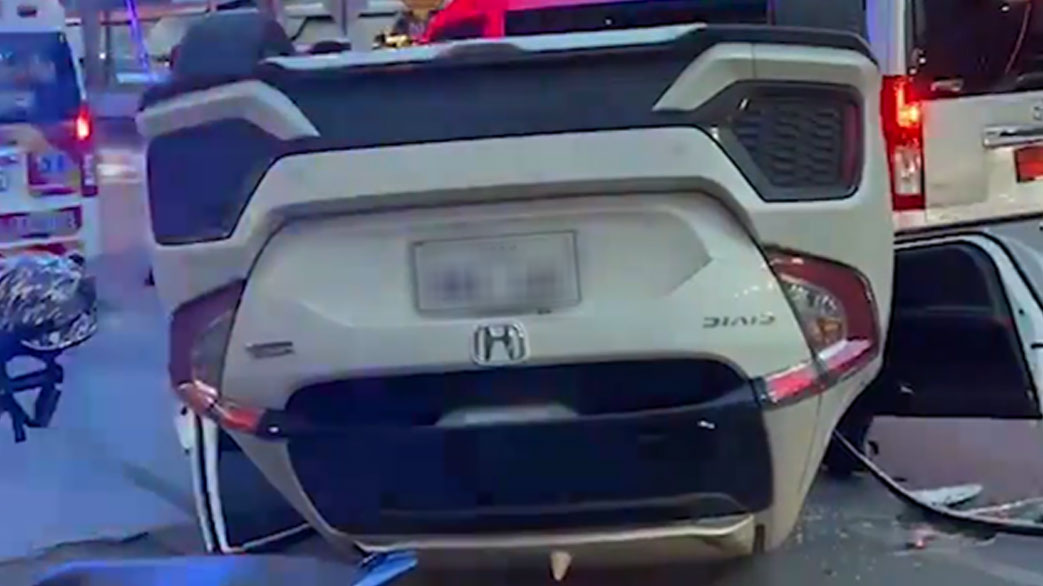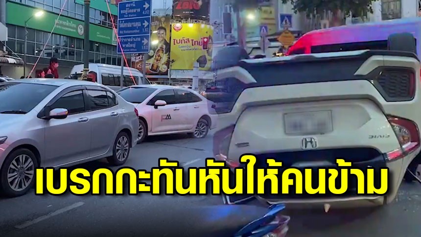 เก๋งเบรกกะทันหันให้คนข้าม ทำเกิดอุบัติเหตุพุ่งชน 3 คันรวด พลิกคว่ำ 1