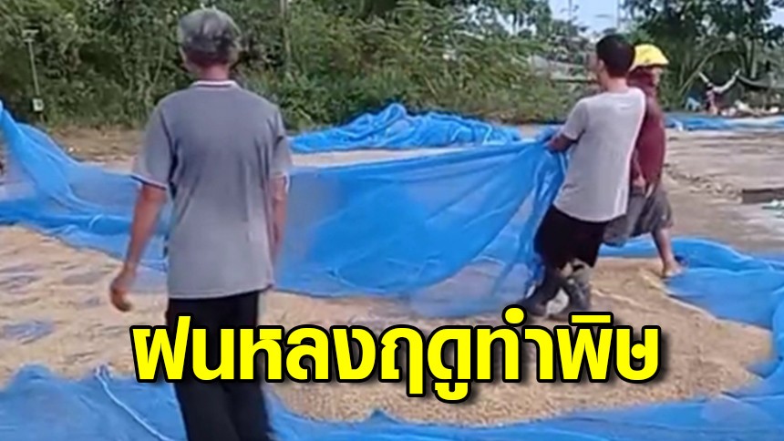 ทุกข์ชาวนาฝนหลงฤดูทำข้าวเปลือกที่ตากไว้เสียหายหมด โอดเจอน้ำท่วมแล้วยังมาเจอฝนตกซ้ำ