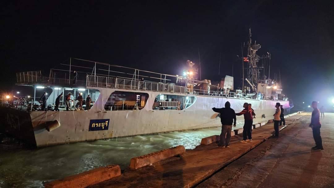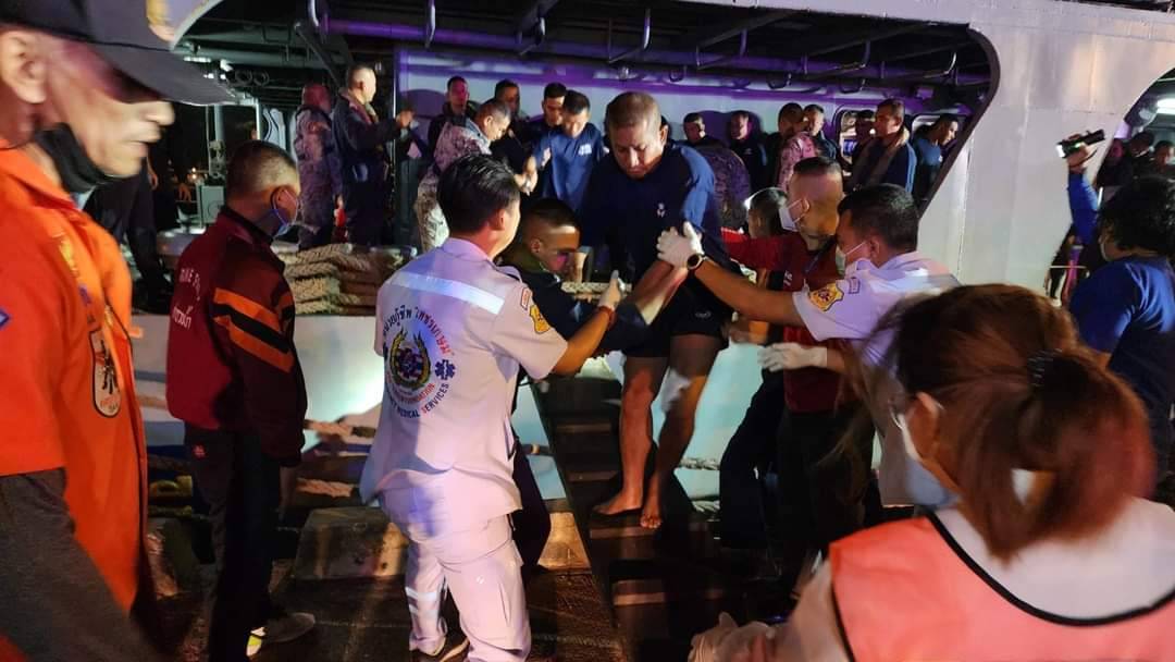 กองทัพเรือ ลำเลียงกำลังพล ที่ลอยคออยู่ในทะเล หลังจากเรือหลวงสุโขทัย จมลงโดยกำลังพลชุดแรก 43 คน เข้าถึงท่าเทียบเรือน้ำลึกบางสะพาน