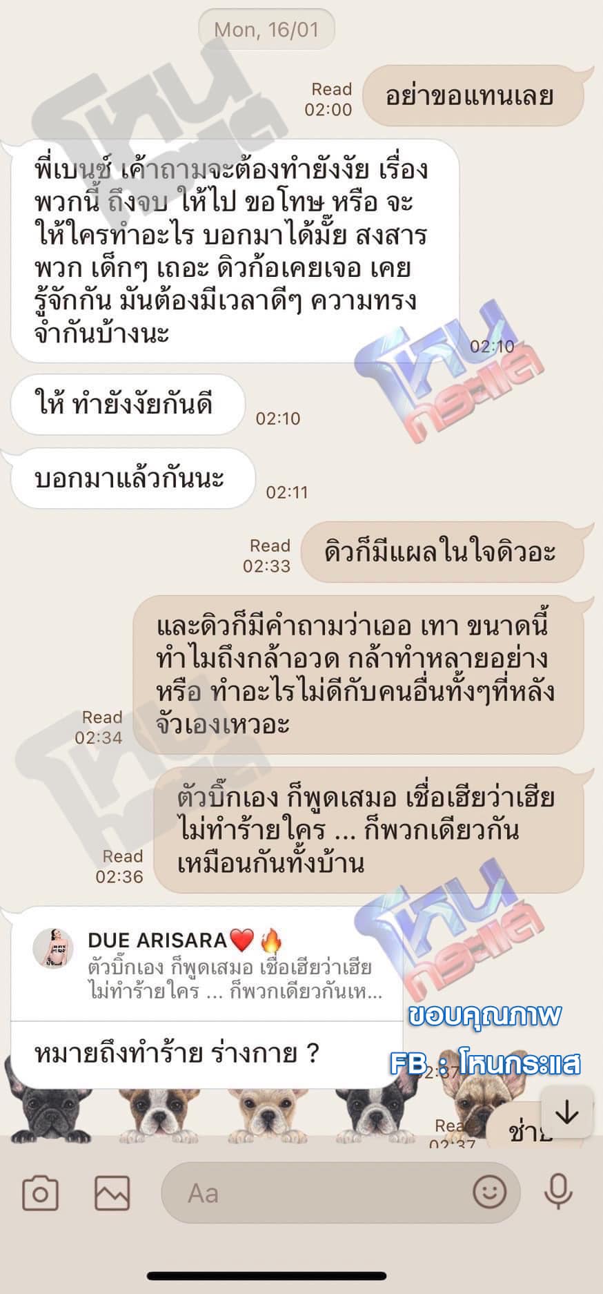 หลังสาวดิว อริสรา ออกมาไลฟ์ ผ่านอินสตาแกรม ส่วนตัว ถึงสาเหตุในการแฉ ครอบครัวเบนซ์ เดม่อน ที่ทำธุรกิจสีเทา เปิดเว็บพนันมาเก๊า 888 โดยก่อนหน้านั้น เพจ ‘โหนกระแส’ เปิดแชตร้อน! เปิดแชตไลน์หาดิว อริสรา โอดต้องทำอย่างไรถึงจะจบ ให้ไปขอโทษด้วยตัวเองก็ได้