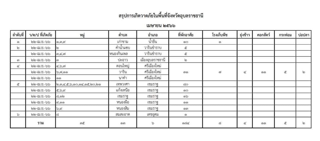 ขณะเดียวกันที่ ตำบลหนองนกทา อ.เขมราฐ จ.อุบลราชธานี ประสบภัยจากพายุฤดูร้อน ก็ได้รับผลกระทบจากพายุฤดูร้อนด้วยเช่นกัน บ้านเรือนประชาชนเสียหาย โดยเฟซบุ๊ก เพจวารินชำราบบ้านเฮา อุบลราชธานี ได้โพสต์รูปภาพความเสียหายที่ได้เผชิญเมื่อช่วงเย็นของวันที่ 22 เม.ย. ที่ผ่านมา