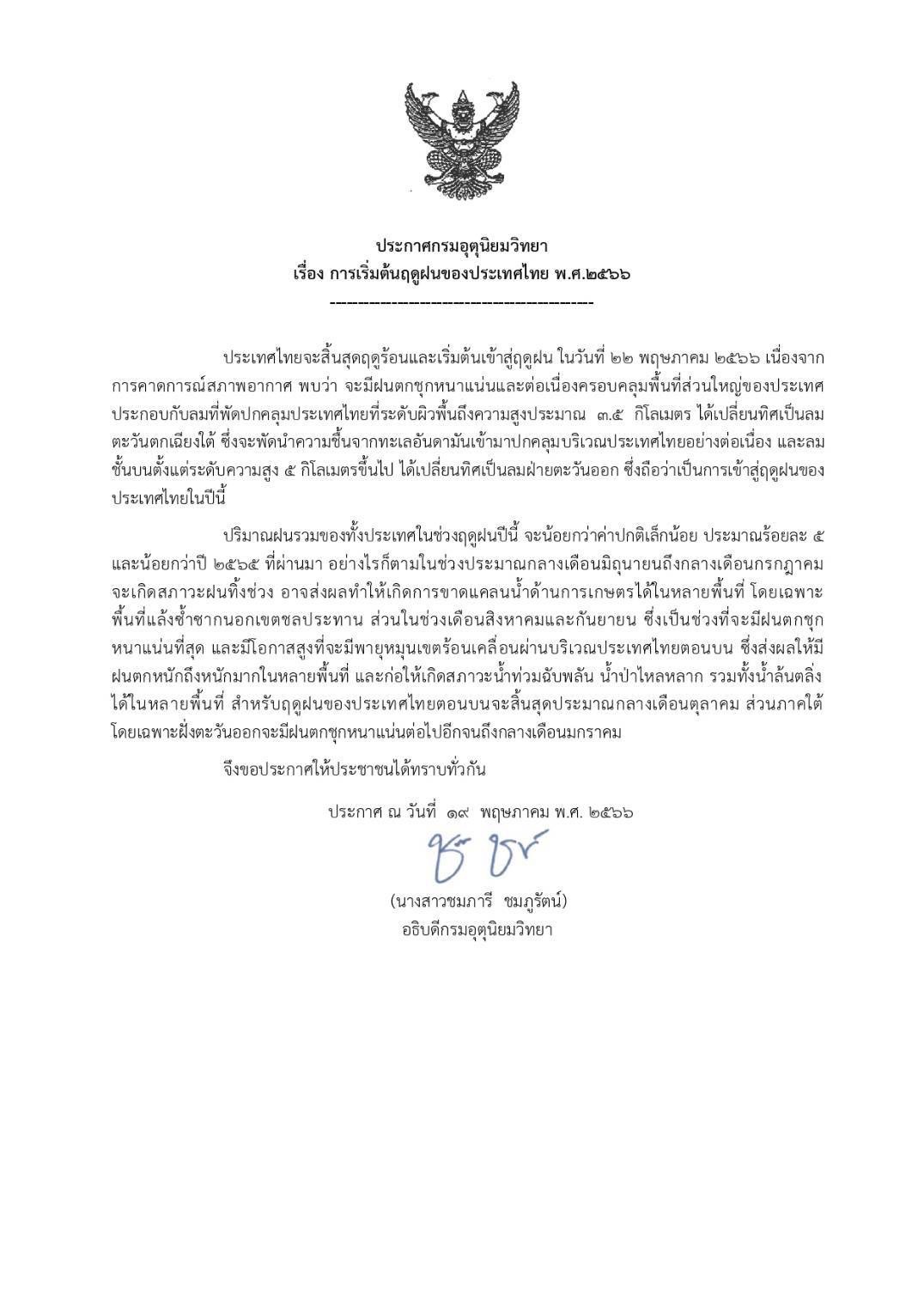 (19 พ.ค.) กรมอุตุนิยมวิทยาประกาศ การเริ่มต้นฤดูฝนของประเทศไทย พ.ศ.2566 ประเทศไทยจะสิ้นสุดฤดูร้อนและเริ่มต้นเข้าสู่ฤดูฝน ในวันที่ 22 พฤษภาคม 2566 เนื่องจากการคาดการณ์สภาพอากาศ พบว่า จะมีฝนตกชุกหนาแน่นและต่อเนื่องครอบคลุมพื้นที่ส่วนใหญ่ของประเทศประกอบกับลมที่พัดปกคลุมประเทศไทยที่ระดับผิวพื้นถึงความสูงประมาณ 3.5 กิโลเมตร ได้เปลี่ยนทิศเป็นลมตะวันตกเฉียงใต้ ซึ่งจะพัดนำความชื้นจากทะเลอันดามันเข้ามาปกคลุมบริเวณประเทศไทยอย่างต่อเนื่อง และลมชั้นบนตั้งแต่ระดับความสูง 5 กิโลเมตรขึ้นไป ได้เปลี่ยนทิศเป็นลมฝ่ายตะวันออก ซึ่งถือว่าเป็นการเข้าสู่ฤดูฝนของประเทศไทยในปีนี้