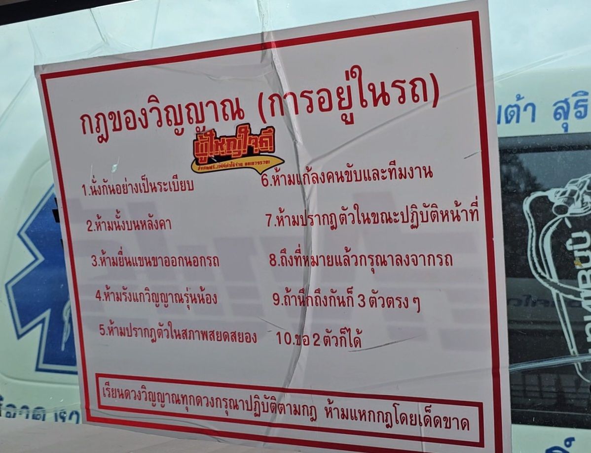 สำหรับหัวข้อเขียนไว้ว่า "กฎของวิญญาณ" เนื้อหาประมาณว่า ให้นั่งกันอย่างเป็นระเบียบ, ห้ามนั่งบนหลังคา, ห้ามยื่นแขนขาออกนอกรถ, ห้ามรังแกวิญญาณรุ่นน้อง, ห้ามปรากฏตัวภาพสยดสยอง, ห้ามแกล้งคนขับและทีมงาน, ห้ามปรากฏตัวในขณะปฏิบัติหน้าที่, ถึงที่หมายแล้วกรุณาลงจากรถ, ถ้านึกถึงกันก็ขอ 3 ตัวตรงๆ, และ ขอ 2 ตัวก็ได้ ซึ่งวิญญาณท่านใดที่ขึ้นรถกู้ภัยแล้วโปรดอ่านและปฏิบัติตามกฎอย่างเคร่งครัด ห้ามแหกกฎเด็ดขาด ซึ่งก็ได้ติดป้ายสติกเกอร์ไว้ที่ภายในรถกู้ภัยสุรินทร์