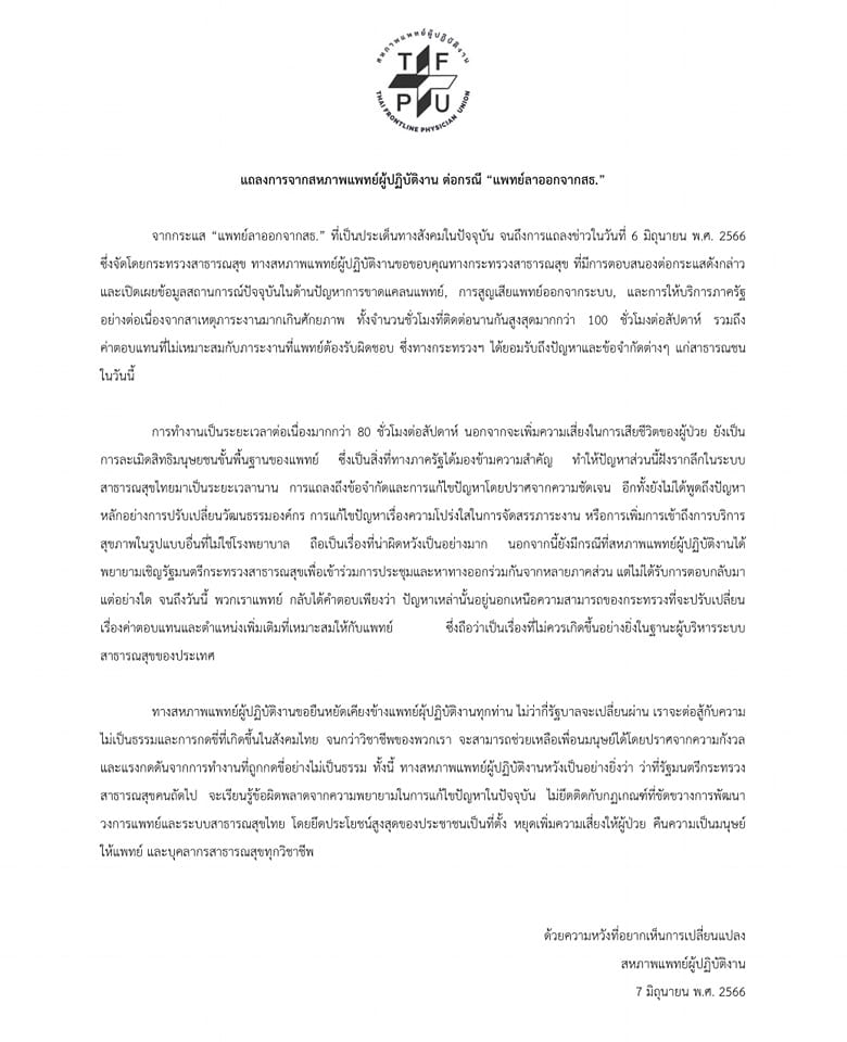 จากกระแส “แพทย์ลาออกจากสธ.” ที่เป็นประเด็นทางสังคมในปัจจุบัน จนถึงการแถลงข่าวในวันที่ 6 มิถุนายน พ.ศ. 2566 ซึ่งจัดโดยกระทรวงสาธารณสุข ทางสหภาพแพทย์ผู้ปฏิบัติงานขอขอบคุณทางกระทรวงสาธารณสุข ที่มีการตอบสนองต่อกระแสดังกล่าว และเปิดเผยข้อมูลสถานการณ์ปัจจุบันในด้านปัญหาการขาดแคลนแพทย์, การสูญเสียแพทย์ออกจากระบบ, และการให้บริการภาครัฐอย่างต่อเนื่องจากสาเหตุภาระงานมากเกินศักยภาพ ทั้งจำนวนชั่วโมงที่ติดต่อนานกันสูงสุดมากกว่า 100 ชั่วโมงต่อสัปดาห์ รวมถึงค่าตอบแทนที่ไม่เหมาะสมกับภาระงานที่แพทย์ต้องรับผิดชอบ ซึ่งทางกระทรวงฯ ได้ยอมรับถึงปัญหาและข้อจำกัดต่างๆ แก่สาธารณชน