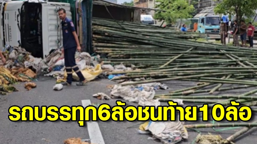 รถบรรทุกขยะรีไซเคิลหลับในพุ่งชนท้ายรถบรรทุกกอไผ่เสียหลักพลิกคว่ำ กอไผ่ร่วม 1,000 ลำตกเกลื่อนถนน