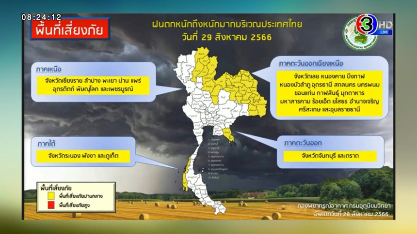 วันที่ 29 สิงหาคม กรมอุตุนิยมวิทยา พยากรณ์อากาศประจำวัน ใจความว่า ร่องมรสุมกำลังแรงพาดผ่านภาคเหนือ ภาคตะวันออกเฉียงเหนือตอนบน เข้าสู่หย่อมความกดอากาศต่ำบริเวณอ่าวตังเกี๋ย ในขณะที่มรสุมตะวันตกเฉียงใต้กำลังค่อนข้างแรงพัดปกคลุมทะเลอันดามัน ประเทศไทย และอ่าวไทย
