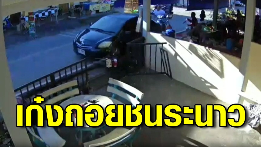 เก๋งเข้าเกียร์ถอยหลังรองเท้าขัดเบรก พุ่งชนจยย.ล้มคว่ำรวด 3 คัน บาดเจ็บ 2