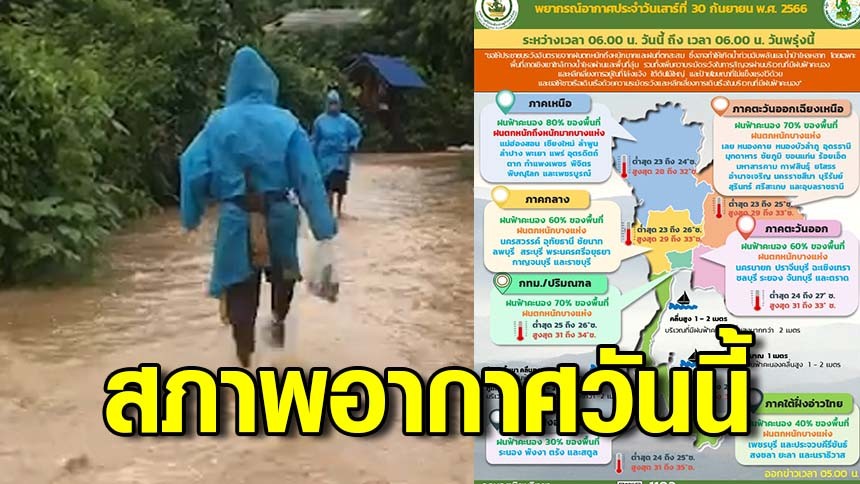 (30 ก.ย.) กรมอุตุฯ พยากรณ์อากาศ 24 ชั่วโมงข้างหน้า ร่องมรสุมพาดผ่านภาคเหนือตอนล่าง ภาคกลางตอนบน และภาคตะวันออกเฉียงเหนือ ประกอบกับมรสุมตะวันตกเฉียงใต้ที่พัดปกคลุมทะเลอันดามัน ภาคกลาง ภาคตะวันออก ภาคใต้ และอ่าวไทยเริ่มมีกำลังอ่อนลง ลักษณะเช่นนี้ยังคงทำให้มีฝนตกหนักบริเวณภาคตะวันออกเฉียงเหนือ ภาคกลางรวมทั้งกรุงเทพมหานครและปริมณฑล ภาคตะวันออก และภาคใต้ โดยมีฝนตกหนักมากบางแห่งบริเวณภาคเหนือ ขอให้ประชาชนในบริเวณดังกล่าวระวังอันตรายจากฝนตกหนักถึงหนักมากและฝนที่ตกสะสม ซึ่งอาจทำให้เกิดน้ำท่วมฉับพลันและน้ำป่าไหลหลาก โดยเฉพาะพื้นที่ลาดเชิงเขาใกล้ทางน้ำไหลผ่านและพื้นที่ลุ่ม รวมทั้งเพิ่มความระมัดระวังในการสัญจรผ่านบริเวณที่มีฝนฟ้าคะนองและหลีกเลี่ยงการอยู่ในที่โล่งแจ้ง ใต้ต้นไม้ใหญ่ และป้ายโฆษณาที่ไม่แข็งแรงไว้ด้วย